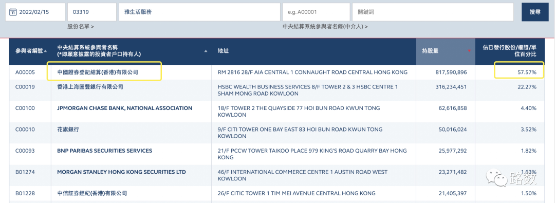 因?yàn)檠派钍荋股結(jié)構(gòu)公司,大股東通過境內(nèi)公司持有雅生活股份。顯示在港交所中央結(jié)算系統(tǒng)中,大股東的賬戶由中證登持有。▼