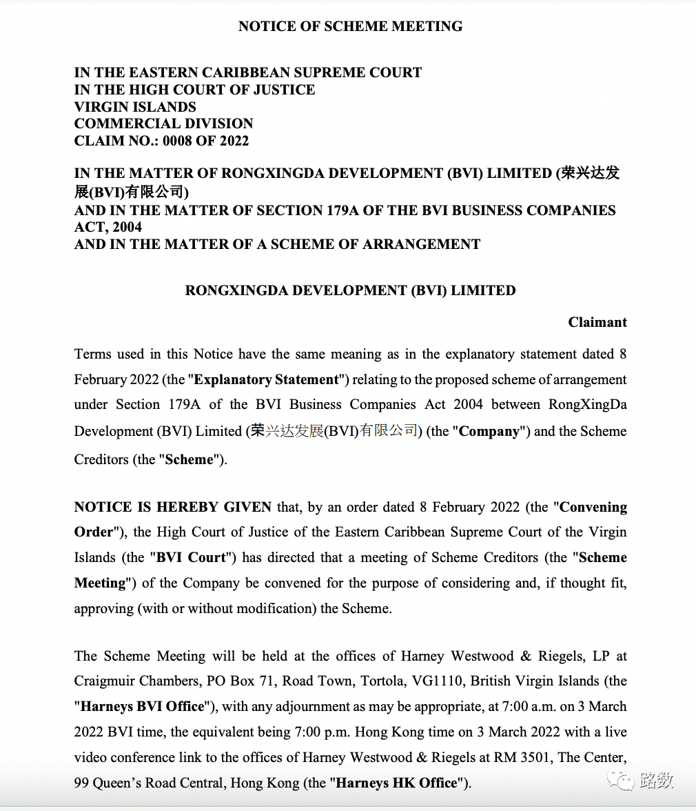 榮盛發(fā)展在1月向BVI法院遞交了協(xié)議安排的申請(qǐng),并于2月8日獲批。香港時(shí)間3月3日傍晚7點(diǎn),將進(jìn)行協(xié)議安排會(huì)議。▼