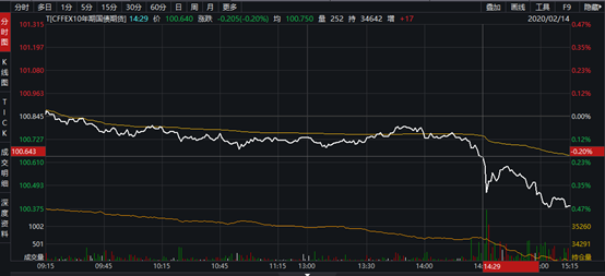 2月14日,國債期貨的閃崩其實還挺讓人搞不懂的。上午受股市連續多日向好影響(大家已經對股市回調放棄幻想了),T開盤后略有下行,但幅度不大,整體1-2毛左右波動。午后,T略有拉升,但還是低于開盤價,整體交易量也不大。與之相對,大A股午后也略有回落,但仍飄紅。