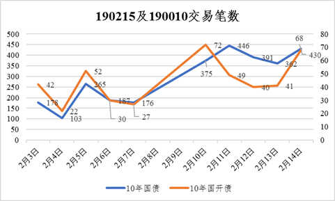 說好的1個BP玩一天呢,咋突然開起過山車了~通過交易筆數,我們可窺見在2月10日之后,215的交易量與節前大致持平。但其利率水平,除卻2月10日收在3.20,其他交易日基本都以3.25-3.26居多。