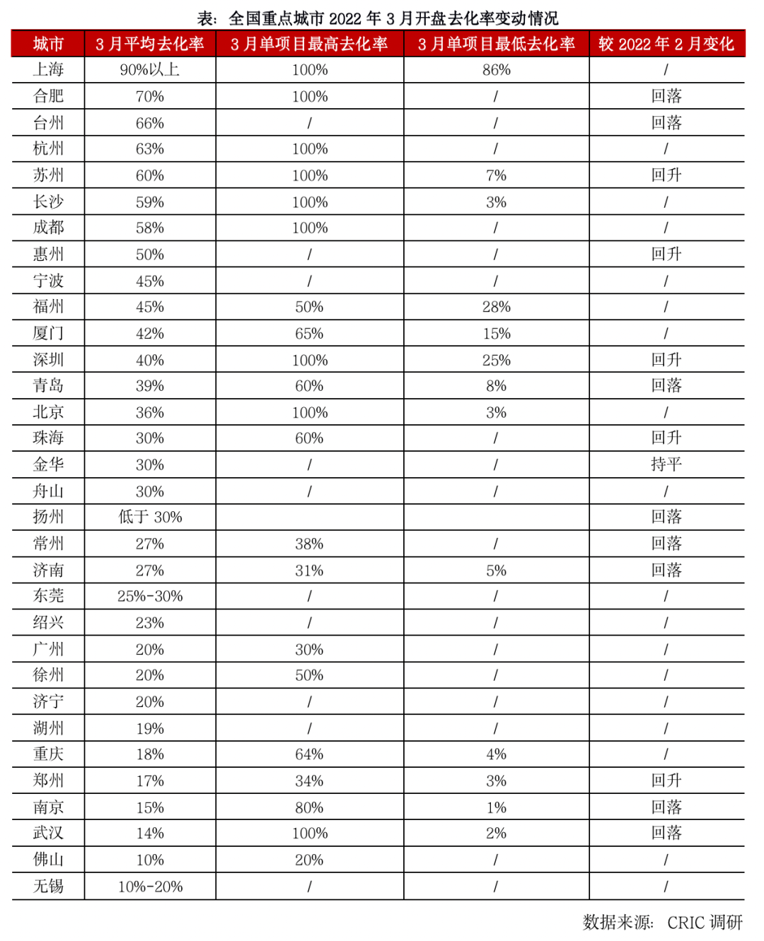 目前來看,3月市場“高熱不退”的主要集中在上海、北京和杭州。上海即便在與日俱增的新冠案例和瀕臨“封城”的重創下,3月開盤去化率依然居不同城市之首,高達90%以上。據CRIC監測數據,上海3月、9個已入市項目中,5個項目觸發積分搖號,認籌率200%左右,入市項目平均去化率在90%以上,即便銷售最差的項目去化率也高達80%以上,市場熱度可見一般。