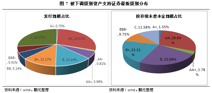 從級(jí)別下調(diào)程度來看[3],共有21支資產(chǎn)支持證券級(jí)別被下調(diào)1個(gè)級(jí)別階數(shù)[4],9支資產(chǎn)支持證券級(jí)別被下調(diào)12個(gè)級(jí)別階數(shù),4支資產(chǎn)支持證券被下調(diào)17個(gè)級(jí)別階數(shù)(見圖6)。被下調(diào)資產(chǎn)支持證券的最新級(jí)別主要分布于AA、C及B,被下調(diào)資產(chǎn)支持證券且仍處于存續(xù)期內(nèi)的資產(chǎn)支持證券級(jí)別主要分布于AA、B+及B(見圖6及圖7)。總體來看,相對(duì)于傳統(tǒng)債券,國內(nèi)資產(chǎn)支持證券被下調(diào)級(jí)別的數(shù)目較少,但單次下調(diào)的幅度會(huì)高于傳統(tǒng)債券單次下調(diào)的幅度,這也是資產(chǎn)支持證券評(píng)級(jí)與傳統(tǒng)債券評(píng)級(jí)的主要差異之一(BIS,2005)。