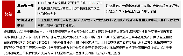 近期熱議的合肥中院對(duì)凱迪電力一期ABS基礎(chǔ)資產(chǎn)與原始權(quán)益人獨(dú)立性的司法判定是我國證券化市場上首個(gè)司法機(jī)構(gòu)對(duì)基礎(chǔ)資產(chǎn)與原始權(quán)益人獨(dú)立性的判定案例,為我國收費(fèi)收益權(quán)類基礎(chǔ)資產(chǎn)實(shí)現(xiàn)與原始權(quán)益人的破產(chǎn)隔離提供了重要的參考。關(guān)于這個(gè)案例的經(jīng)過可參考相關(guān)研究報(bào)告[16],本文不再贅述。對(duì)于這個(gè)案例,我們這里從信用風(fēng)險(xiǎn)的角度進(jìn)行分析。(a)此次判定結(jié)果從兩個(gè)層面上認(rèn)定了基礎(chǔ)資產(chǎn)與原始權(quán)益人的獨(dú)立性:首先,認(rèn)定基礎(chǔ)資產(chǎn)為真實(shí)銷售,確定了基礎(chǔ)資產(chǎn)與原始權(quán)益人間的獨(dú)立關(guān)系,保護(hù)基礎(chǔ)資產(chǎn)現(xiàn)金流不受原始權(quán)益人其他債權(quán)人影響;其次,從資產(chǎn)服務(wù)機(jī)構(gòu)角度,“合肥科農(nóng)行大興支行曾經(jīng)抗辯稱,《基礎(chǔ)資產(chǎn)買賣協(xié)議》明確約定在監(jiān)管銀行將電費(fèi)收入劃入專項(xiàng)計(jì)劃賬戶后,該筆款項(xiàng)的所有權(quán)才歸專項(xiàng)計(jì)劃所有,劃轉(zhuǎn)之前仍屬南陵凱迪公司所有,現(xiàn)相關(guān)款項(xiàng)并未到賬,故相關(guān)電費(fèi)收入尚不屬于平安凱迪專項(xiàng)計(jì)劃享有。合肥中院對(duì)此作出明確區(qū)分,不能以資金歸屬界定電力上網(wǎng)收費(fèi)權(quán)的歸屬”,我們認(rèn)為合肥中院的這一認(rèn)定,確認(rèn)了基礎(chǔ)資產(chǎn)與資產(chǎn)服務(wù)機(jī)構(gòu)間的獨(dú)立性。(b)凱迪電力一期ABS交易結(jié)構(gòu)的設(shè)置在能夠一定程度上減輕專項(xiàng)計(jì)劃投資者損失:首先,根據(jù)《專項(xiàng)計(jì)劃說明書》,“原始權(quán)益人將基礎(chǔ)資產(chǎn)質(zhì)押給專項(xiàng)計(jì)劃,并在人民銀行征信中心辦理與基礎(chǔ)資產(chǎn)質(zhì)押有關(guān)的登記公示”,雖然基礎(chǔ)資產(chǎn)質(zhì)押可能導(dǎo)致基礎(chǔ)資產(chǎn)被判定為非真實(shí)出售,但其能防止原始權(quán)益人將基礎(chǔ)資產(chǎn)用于其他目的二次質(zhì)押;其次,根據(jù)《專項(xiàng)計(jì)劃說明書》,專項(xiàng)計(jì)劃設(shè)置了權(quán)利完善事件,當(dāng)資產(chǎn)服務(wù)機(jī)構(gòu)、原始權(quán)益人或差額支付承諾人及監(jiān)管賬戶出現(xiàn)異常時(shí),通知電力公司將基礎(chǔ)資產(chǎn)對(duì)應(yīng)電費(fèi)收入直接轉(zhuǎn)付至專項(xiàng)計(jì)劃賬戶或其他指定賬戶,這一措施能在一定程度上緩釋基礎(chǔ)資產(chǎn)現(xiàn)金流受相關(guān)主體信用質(zhì)量惡化的不利影響;最后,原始權(quán)益人所擁有的機(jī)器設(shè)備、土地房產(chǎn)及原始權(quán)益人股權(quán)質(zhì)押給管理人,這個(gè)措施一方面能防止原始權(quán)益人及相關(guān)機(jī)器設(shè)備受其他債權(quán)人不利影響進(jìn)而導(dǎo)致基礎(chǔ)資產(chǎn)無法正常產(chǎn)生現(xiàn)金流,另一方面當(dāng)基礎(chǔ)資產(chǎn)無法正常產(chǎn)生現(xiàn)金流時(shí),專項(xiàng)計(jì)劃投資者相對(duì)于其他債權(quán)人來說擁有對(duì)機(jī)器設(shè)備、土地房產(chǎn)及原始權(quán)益人股權(quán)的處置優(yōu)先權(quán)。(c)專項(xiàng)計(jì)劃管理人盡職的重要性:本案例中管理人的盡職能力的重要性體現(xiàn)在其代表投資者維護(hù)基礎(chǔ)資產(chǎn)不受原始權(quán)益人其他債權(quán)人影響方面。