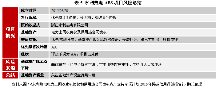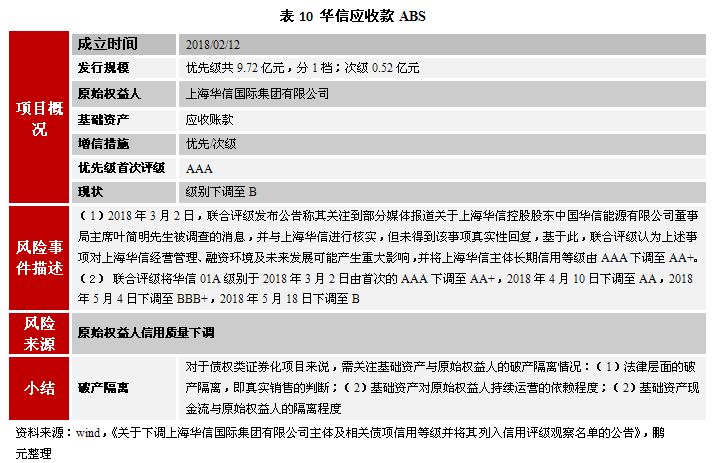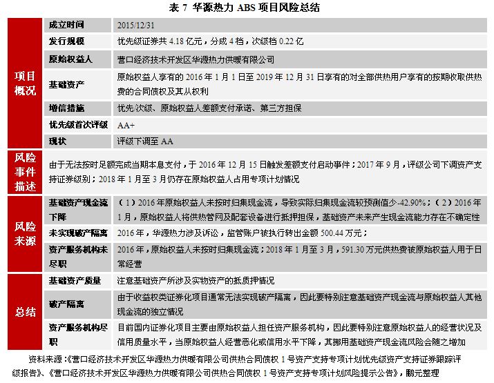 值得注意的是,在對(duì)基礎(chǔ)資產(chǎn)質(zhì)量關(guān)注方面,我們還需關(guān)注基礎(chǔ)資產(chǎn)及基礎(chǔ)資產(chǎn)所涉及的實(shí)物資產(chǎn)是否存在權(quán)利瑕疵。例如,華源熱力ABS項(xiàng)目中,原始權(quán)益人在2016年1月將供熱管網(wǎng)及配套設(shè)備進(jìn)行抵押擔(dān)保,導(dǎo)致基礎(chǔ)資產(chǎn)未來產(chǎn)生現(xiàn)金流能力存在不確定性。