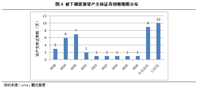 從被下調(diào)的資產(chǎn)支持證券到期期限來看,有9支資產(chǎn)支持證券已確認(rèn)本金違約,10只資產(chǎn)支持證券已償清,剩余存續(xù)的23只資產(chǎn)支持證券中,其到期日主要分布于2018年至2021年間。