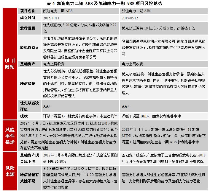 雖然一個(gè)標(biāo)準(zhǔn)化的證券化產(chǎn)品強(qiáng)調(diào)要實(shí)現(xiàn)破產(chǎn)隔離,以實(shí)現(xiàn)用資產(chǎn)信用代替主體信用的目的。但目前國內(nèi)證券化項(xiàng)目的基礎(chǔ)資產(chǎn)對(duì)原始權(quán)益人持續(xù)運(yùn)營能力依賴性強(qiáng)或需要原始權(quán)益人為基礎(chǔ)資產(chǎn)持續(xù)運(yùn)營提供運(yùn)營資金支持,并且有多數(shù)項(xiàng)目采用引入差額補(bǔ)償承諾或第三方擔(dān)保,從而導(dǎo)致目前國內(nèi)證券化產(chǎn)品對(duì)主體的信用表現(xiàn)有較強(qiáng)的依賴性。在凱迪電力一期ABS項(xiàng)目中,存在因差額支付承諾人凱迪生態(tài)流動(dòng)性資金緊張、無法支付燃料購買款,進(jìn)而導(dǎo)致發(fā)電機(jī)組停機(jī)狀況。在凱迪電力二期ABS項(xiàng)目中,由于專項(xiàng)計(jì)劃現(xiàn)金流不足以完成優(yōu)先級(jí)剩余本息兌付,需啟動(dòng)凱迪生態(tài)差額支付機(jī)制,但凱迪生態(tài)差額支付能力存在卻較大不確定性。