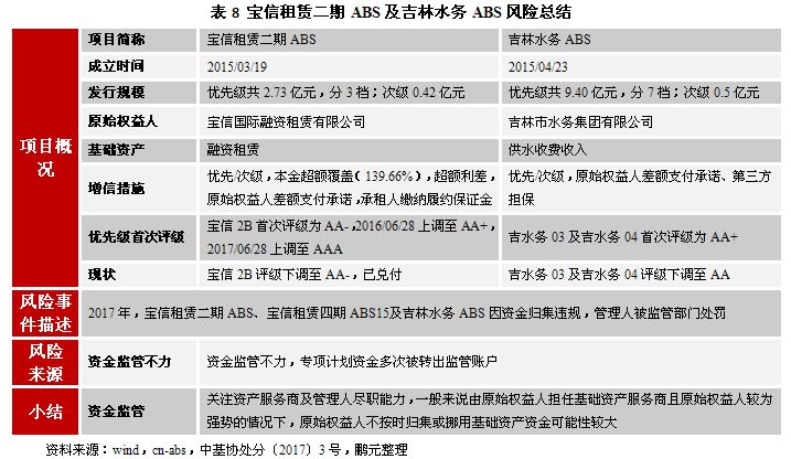 資產(chǎn)服務(wù)機(jī)構(gòu)、管理人等其他主要參與主體是否盡職盡責(zé),是決定基礎(chǔ)資產(chǎn)現(xiàn)金流能否順利實(shí)現(xiàn)由基礎(chǔ)資產(chǎn)流轉(zhuǎn)至投資人手中的關(guān)鍵因素。在華源熱力ABS項(xiàng)目中,作為資產(chǎn)服務(wù)機(jī)構(gòu)的原始權(quán)益人在2016年未及時(shí)將基礎(chǔ)資產(chǎn)現(xiàn)金流歸集從而導(dǎo)致基礎(chǔ)資產(chǎn)現(xiàn)金流較預(yù)期大幅下降,此外原始權(quán)益人未將2018年1-3月[17]收取的基礎(chǔ)資產(chǎn)現(xiàn)金流歸集至監(jiān)管賬戶而用于其日常經(jīng)營。在寶信租賃二期資產(chǎn)支持專項(xiàng)計(jì)劃(以下簡稱“寶信租賃二期ABS”)及吉林水務(wù)供水收費(fèi)權(quán)資產(chǎn)(以下簡稱“吉林水務(wù)ABS”)支持專項(xiàng)計(jì)劃兩個(gè)項(xiàng)目中,計(jì)劃管理人對(duì)資金監(jiān)管不力導(dǎo)致專項(xiàng)計(jì)劃資金多次被轉(zhuǎn)出監(jiān)管賬戶為原始權(quán)益人再使用。在上述三個(gè)項(xiàng)目中,一方面資產(chǎn)服務(wù)機(jī)構(gòu)及管理人未嚴(yán)格對(duì)基礎(chǔ)資產(chǎn)現(xiàn)金流進(jìn)行歸集及監(jiān)管,可能導(dǎo)致相應(yīng)的資產(chǎn)支持證券無法按時(shí)償付風(fēng)險(xiǎn);另一方面,三個(gè)項(xiàng)目中的基礎(chǔ)資產(chǎn)現(xiàn)金流都出現(xiàn)被原始權(quán)益人挪用的情況,這進(jìn)一步加重了基礎(chǔ)資產(chǎn)現(xiàn)金流對(duì)原始權(quán)益人主體信用水平的依賴程度,違背了用資產(chǎn)信用代替主體信用的原則。