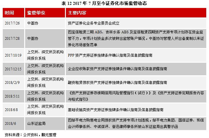 自2014 年底我國資產(chǎn)證券化業(yè)務(wù)監(jiān)管完成了從過去的逐筆審批制向備案制的轉(zhuǎn)變后,我過證券化市場迎來快速增長。但在快速發(fā)展的背后,也隱藏了一定的風(fēng)險(xiǎn)。為防控風(fēng)險(xiǎn),至2017年起,監(jiān)管部門開始加大對(duì)我國資產(chǎn)證券化業(yè)務(wù)的監(jiān)管力度。總體來看,我國證券化市場近期的監(jiān)管動(dòng)態(tài)(見表12)可總結(jié)為:大類資產(chǎn)標(biāo)準(zhǔn)化、政策打補(bǔ)丁及監(jiān)管趨嚴(yán)。