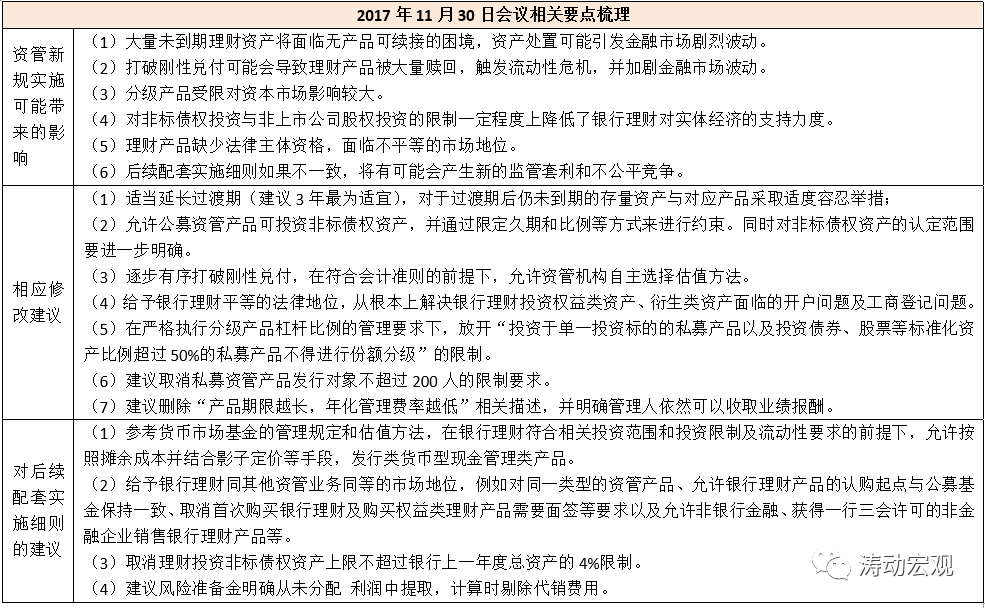 整體上看,本次專題會議的聚焦點主要包括(1)過渡期不夠;(2)期限錯配不應該限制;(3)非標資產有其存在的必要性;(4)凈值型產品轉型短期內存在困難,造成的沖擊較大;(5)《資管新規》部分細則還沒有明確等幾個方面。