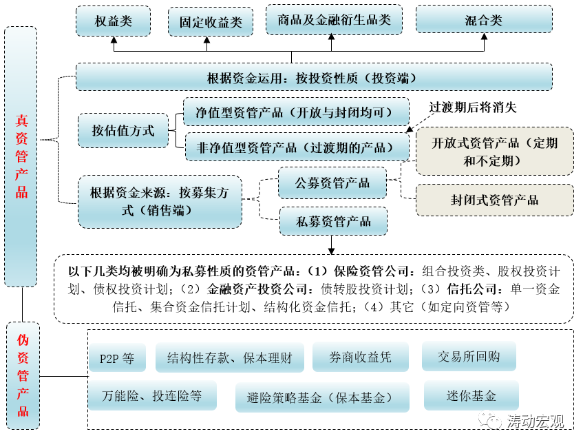 《資管新規》之前,大資管行業的產品分類比較繁雜。如銀行理財便有多種分類方式,如按發行對象劃分(即一般個人理財、高凈值理財、私人銀行理財、機構理財、同業理財);按是否保本劃分(保本理財和非保本理財);按申購特征劃分(開放式與封閉式);按發行方式劃分(公募和私募);按設計特征劃分(分級與非分級);按投資對象劃分(固定類、權益類、商品及衍生品類、混合類)等等。上述分類方式之間有一定重復甚至不合適宜的地方。