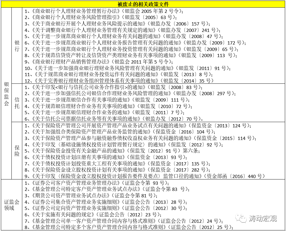 《資管新規》后,大資管行業的政策格局已被重塑,之前相關的一系列政策文件大多已退出歷史舞臺(被廢止),具體看,銀行體系有12份政策文件被廢止(包括2013年的8號文和2014年的35號文)、信托體系有6份政策文件被廢止(待信托新規正式稿出臺后進一步明確)、保險體系有9份政策文件被廢止、證監會體系有8份政策文件被廢止。