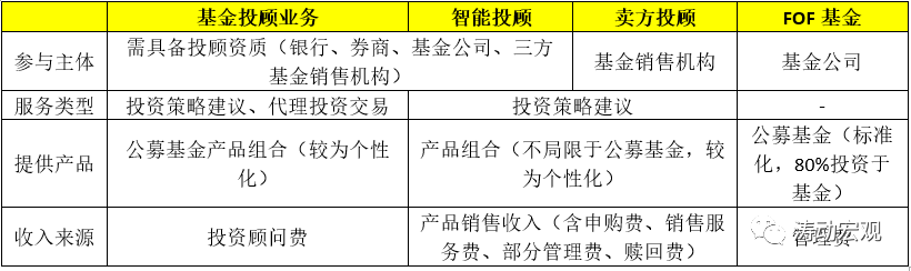 (3)目前大資管行業中,主要有基金投顧、FOF產品賣方投顧以及智能投顧等四種方式從事類似的投顧業務,這四種模式具有一定差異,其中從事基金投顧、智能投顧的機構需要取得投資顧問資質。