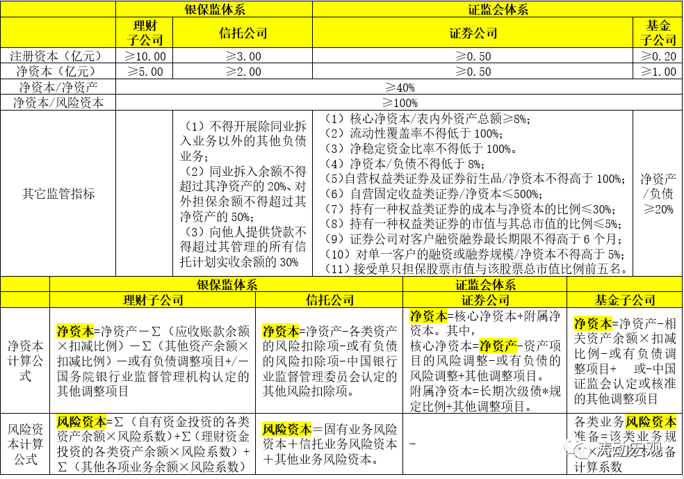雖然各類資管行業的凈資本與注冊資本起點要求不同(理財子公司最高),但一般均要求凈資本/凈資產、凈資本/風險資本分別不得低于40%和100%。