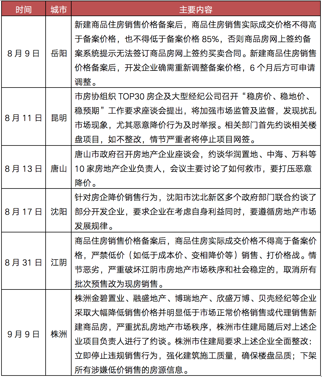 出于穩(wěn)房價、穩(wěn)預(yù)期的需要,岳陽、昆明等6城相繼落地“限跌令”。其中,岳陽、江陰明文規(guī)定禁止大幅降價,昆明、唐山、沈陽、株洲采取約談的方式,禁止房企、中介機(jī)構(gòu)惡意降價、打價格戰(zhàn),擾亂房地產(chǎn)市場秩序。