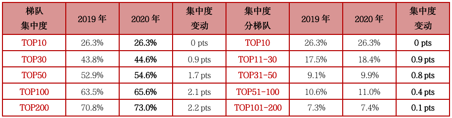 表:2020年TOP200各梯隊房企銷售操盤金額集中度