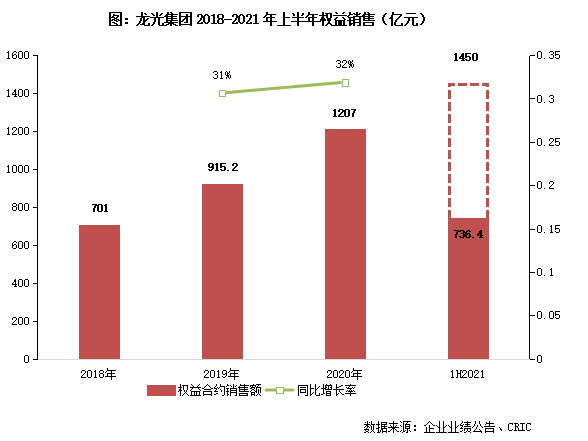 2021年上半年,龍光連續6個月業績均破百億,累計實現權益銷售額736.4億元、權益銷售面積390.5萬平方米,分別同比增長58.9%、28.3%。按全年1450億元銷售目標算,上半年目標完成率達到50.8%。從供貨安排來看,下半年可售貨值有1560億元,新開盤項目有33個,繼續保持銷售節奏,大概率會達成年度目標。