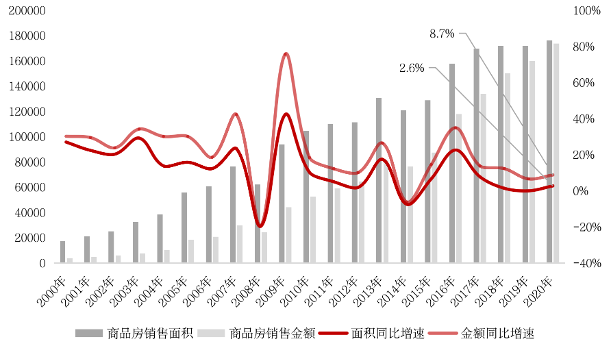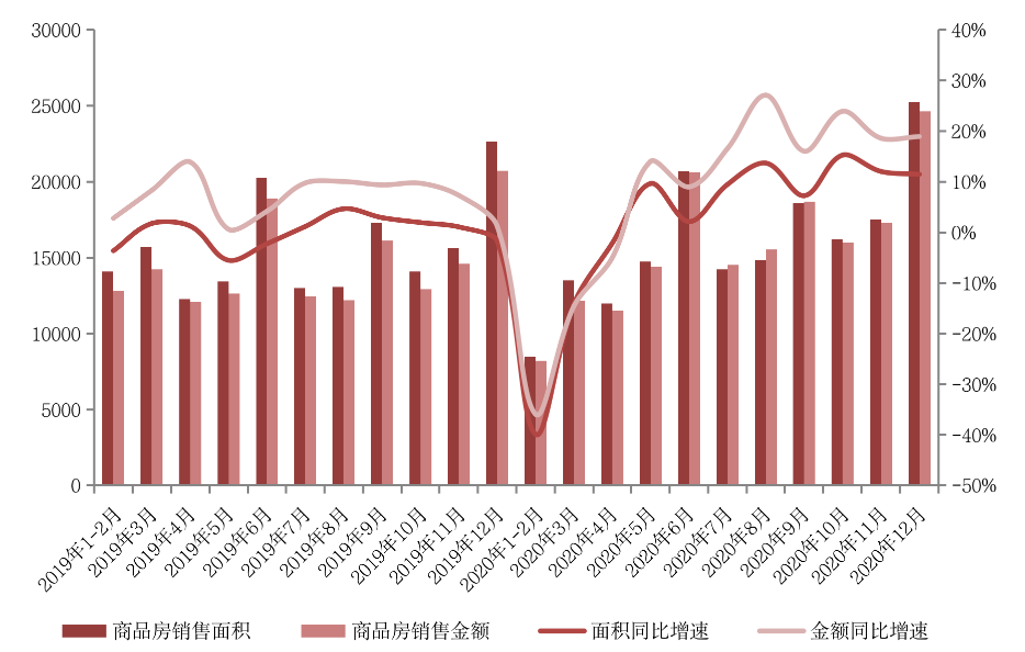 2020年,房地產(chǎn)市場(chǎng)保持較強(qiáng)的韌性,市場(chǎng)表現(xiàn)超預(yù)期,年內(nèi)銷售投資再創(chuàng)新高。1月18日上午,國家統(tǒng)計(jì)局公布了2020年1-12月國民經(jīng)濟(jì)運(yùn)行情況以及房地產(chǎn)行業(yè)數(shù)據(jù),全年房地產(chǎn)開發(fā)投資額141443億元,累計(jì)同比增長7%,商品房銷售面積和銷售金額分別為17.6億平方米、17.4萬億元,分別累計(jì)增長2.6%和8.7%。