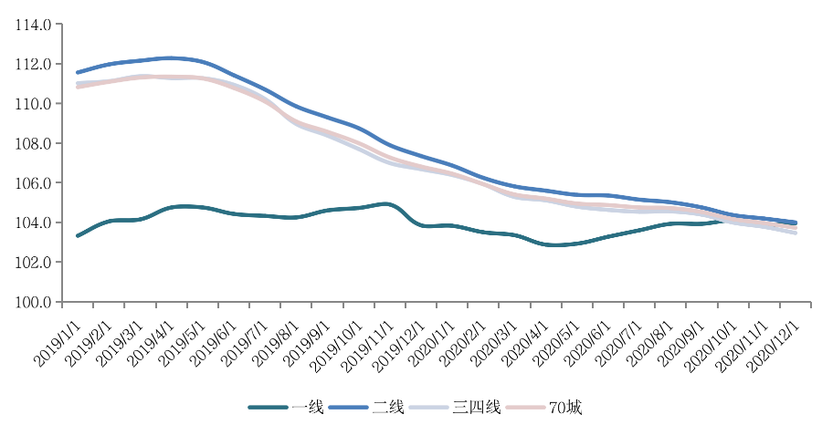 從全國70個(gè)大中城市商品住宅銷售價(jià)格來看,70城房價(jià)穩(wěn)中略漲,其中一手房房價(jià)同比僅一線城市漲幅擴(kuò)大,二線及三四線城市漲幅均繼續(xù)收窄。二手房市場(chǎng)房價(jià)表現(xiàn)與一手房一致,其中一線城市12月環(huán)比翹尾,漲0.5%漲幅擴(kuò)大。其余各能級(jí)城市整體環(huán)比漲幅均持平或收窄。