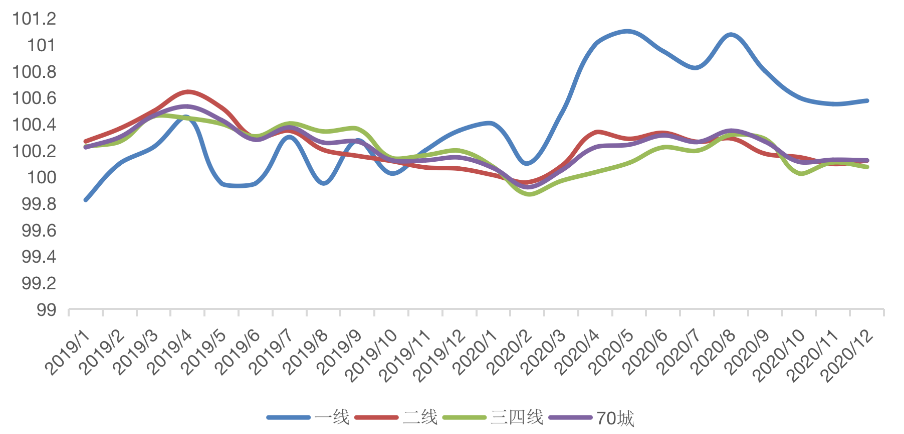 2019年1月以來70城及各能級(jí)城市新建商品住宅價(jià)格指數(shù)同比走勢(shì)