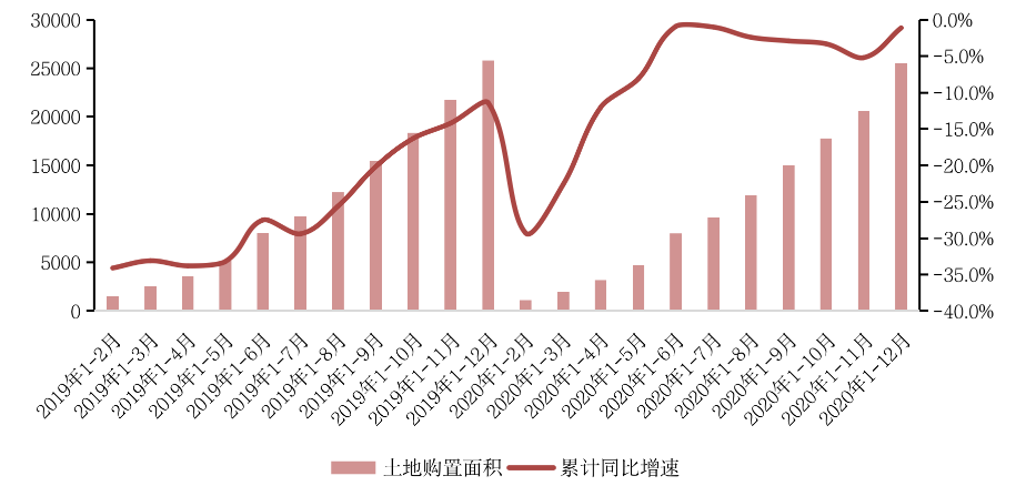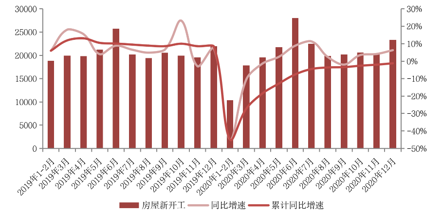 但值得注意的是,對(duì)比來看12月同比增速略低于2019年同期7.4%同比增速。一方面,2020上半年房企土地購置面積仍處于歷史低位,待開發(fā)土地的減少制約了新開工面積的增長;另一方面融資收緊導(dǎo)致房企對(duì)開工繼續(xù)采取保守態(tài)度,在新開工進(jìn)度上審慎而行。