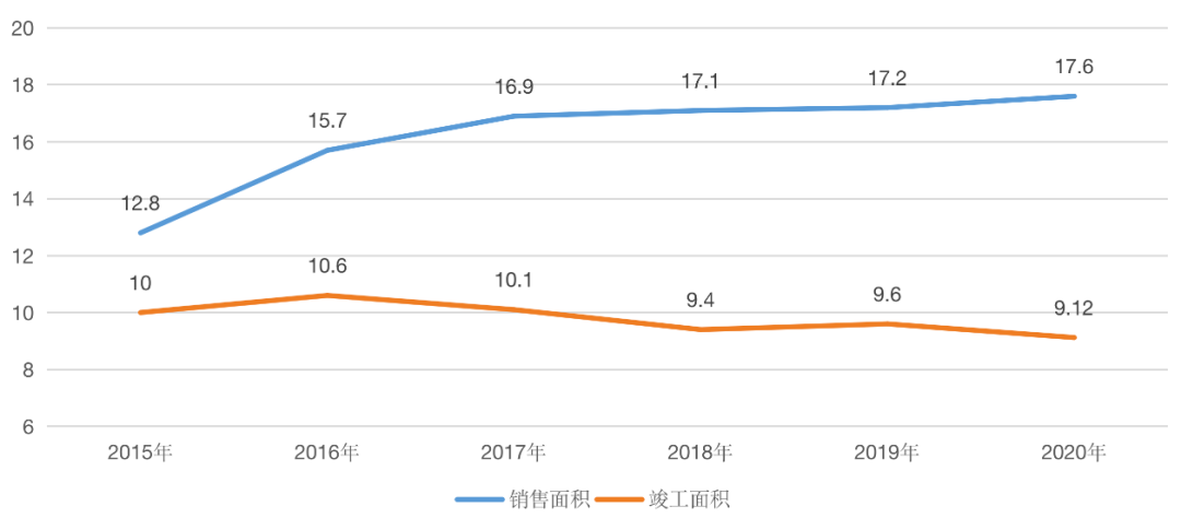 值得注意的是,國家統(tǒng)計(jì)局?jǐn)?shù)據(jù)顯示,房地產(chǎn)銷售面積和竣工面積加速背離。2020年,竣工面積為9.12億平方米,同比減少4.9%。與之形成明顯反差的是,銷售面積同比正增長,兩者差距有擴(kuò)大趨勢(shì)。究其原因,一方面受疫情影響,工期普遍延后,加速竣工增速回落。