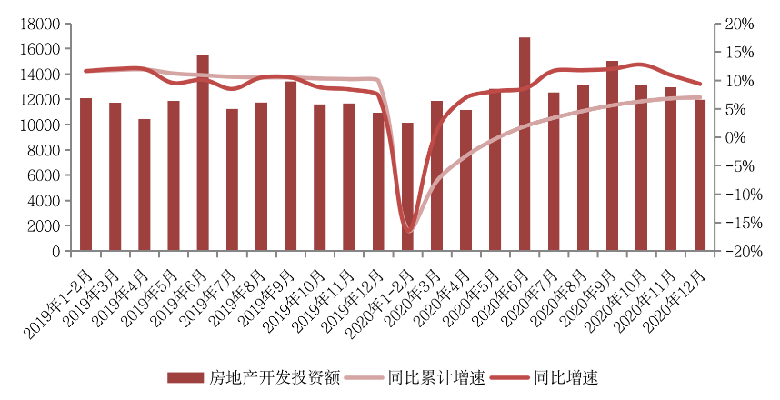 2020年全國房地產(chǎn)開發(fā)投資額達(dá)到141443億元,同比增長7.0%,增速比前11月份提高0.2個(gè)百分點(diǎn)。其中,住宅投資104446億元,增長7.6%。