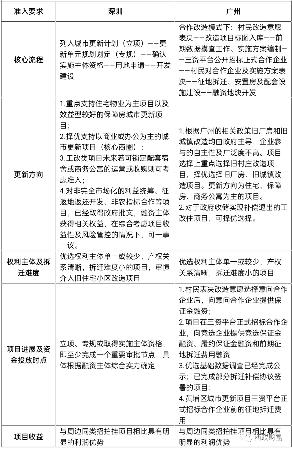 在項目選擇上,綜合考慮項目類型、權利主體及拆遷難度、項目進展以及項目收益情況。以下以深圳和廣州區域城市更新項目為例進行舉例說明: