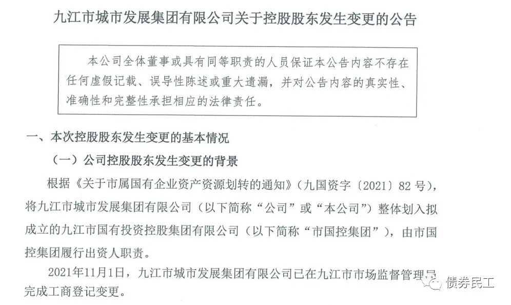 資產(chǎn)無償劃轉(zhuǎn)和資產(chǎn)置換之后,將區(qū)域內(nèi)的重要國有資產(chǎn)進(jìn)行了優(yōu)化重組,實(shí)際上為新城投公司的形成和組建提供了基礎(chǔ)。比如九江市城市發(fā)展集團(tuán)有限公司于2021年11月4日公告,公司整體劃入擬成立的九江市國有投資控股集團(tuán)有限公司,由其履行出資人職責(zé)。九江市國有投資控股集團(tuán)有限公司的注冊(cè)資本為100億元,暫無債券發(fā)行記錄。