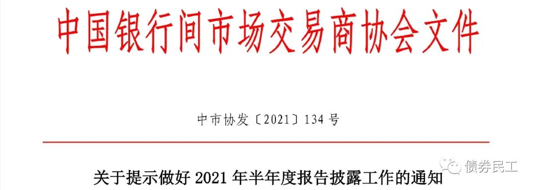 2021年7月23日,中國銀行間市場交易商協(xié)會印發(fā)《關(guān)于提示做好2021年半年度報(bào)告披露工作的通知》(中市協(xié)發(fā)[2021]134號),提示債務(wù)融資工具的發(fā)行人和增信機(jī)構(gòu)做好半年度報(bào)告的披露工作,應(yīng)于 2021 年 8 月 31 日前披露 2021 年半年度報(bào)告。不同于上交所和深交所,在此之前,交易商協(xié)會很少單獨(dú)印發(fā)文件提示半年度報(bào)告披露問題。因此,發(fā)行人和增信機(jī)構(gòu)這次真的是需要嚴(yán)肅對待半年報(bào)的披露問題。