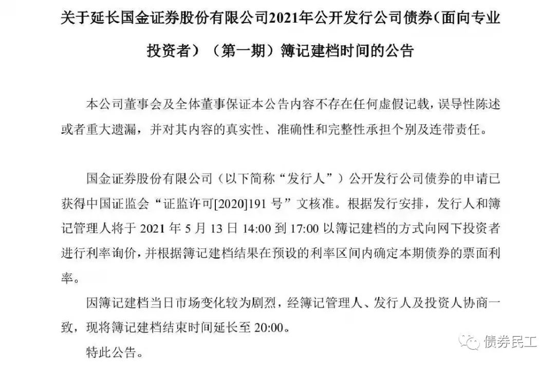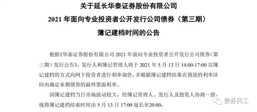 2、華泰證券股份有限公司公告了2021年面向專業投資者公開發行公司債券(第三期)(21華泰G4,發行規模不超過60億元)延長簿記建檔時間的公告,將簿記建檔時間延長到19:00,然后又披露了第二個延長公告,將簿記建檔時間延長至20:00。