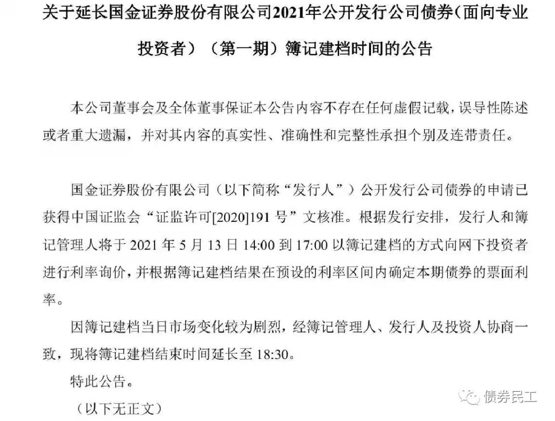 根據wind資訊2021年5月13日的公告信息,多家證券公司發行人公布了債券延長簿記建檔時間公告:分別為國金證券股份有限公司、華泰證券股份有限公司、中信建投證券股份有限公司,延長簿記建檔債券總金額超過100億元,而三家證券公司主體信用評級均為AAA。