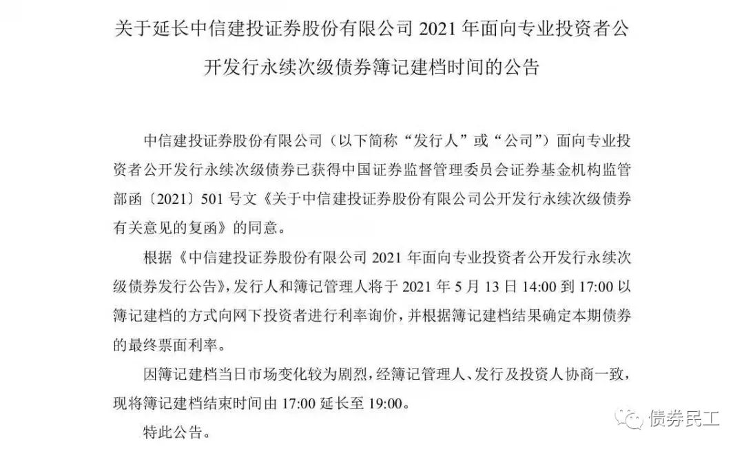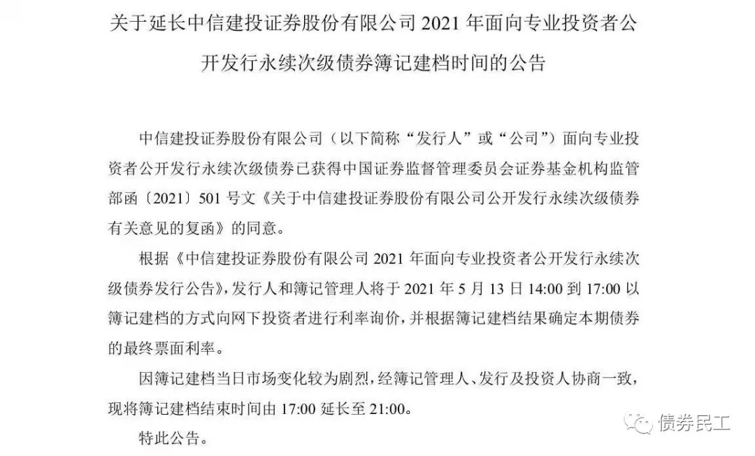 3、中信建投證券股份有限公司公告了2021年面向專業投資者公開發行永續次級債券(21信投Y1,發行規模不超過50億元)延長簿記建檔時間的公告,將簿記建檔時間延長到19:00,然后又披露了第二個延長公告,將簿記建檔時間延長至21:00。