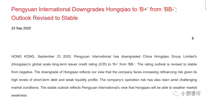 9月23日,鵬元國際將中國宏橋(01378.HK)國際刻度的長期主體評級由“BB-”下調至“B+”,評級展望從負面調至穩定。