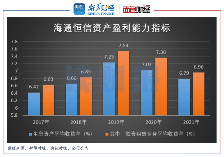 研究發(fā)現(xiàn),海通證券融資租賃子公司海通恒信的資產(chǎn)盈利能力有所下滑。2021年,該公司的生息資產(chǎn)平均收益率和融資租賃業(yè)務(wù)平均收益率分別為6.79%和6.96%,同比分別下降0.24個(gè)百分點(diǎn)和0.4個(gè)百分點(diǎn)。