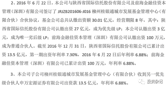 通常,基金類的非標融資,發行人會認購該基金的劣后級或者是普通合伙人份額,再通過該基金融入資金然后放貸給自己。這樣,在發行人的資產科目中的可供出售金融資產或者長期股權投資中會出現此類基金的明細,然后在負債類科目中會發現該類基金有向公司融出資金。換句話說,如果你在可供或者長投里面發現公司持有**(有限合伙)之類的資產,那么應當提高警惕,該類基金可能是公司進行基金融資的載體,需要在負債類科目中仔細尋找,是否有對應的基金類融資。