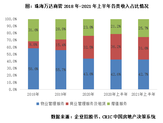 物業(yè)管理服務為珠海萬達最主要的營收來源,商業(yè)管理服務及租賃收入占比持續(xù)上升。根據(jù)企業(yè)招股書披露數(shù)據(jù),2021年上半年,珠海萬達共實現(xiàn)營收106.4億元,其中物業(yè)管理服務45.4億元,商業(yè)管理服務及租賃33.6億元,增值服務收入27.4億元,占比分別為42.7%、31.6%、25.7%。從2018年至2021年上半年的趨勢來看,企業(yè)三項業(yè)務收入均呈現(xiàn)穩(wěn)步增長的態(tài)勢,但商業(yè)管理服務及租賃收入上升更加明顯,因此占比持續(xù)提高,物業(yè)管理服務收入依托企業(yè)在管面積穩(wěn)定增長,仍是企業(yè)發(fā)展的主要方向。