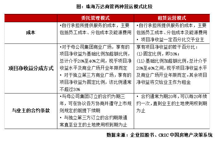 從業(yè)務模式來看,目前珠海萬達采取委托管理和租賃運營兩種模式,企業(yè)均有權享有項目凈收益的20%—40%作為公司收益。根據(jù)企業(yè)招股書介紹,委托管理模式主要是受委托全權負責管理商業(yè)廣場,而租賃運營模式則是從業(yè)主處租賃物業(yè),并將商業(yè)廣場內的商業(yè)空間出租給商戶,同時全權負責管理商業(yè)廣場,租賃運營模式與委托管理模式的服務范圍大體一致。不過萬達的租賃運營模式與行業(yè)傳統(tǒng)型的租賃運營模式不同,主要為收益分成型。