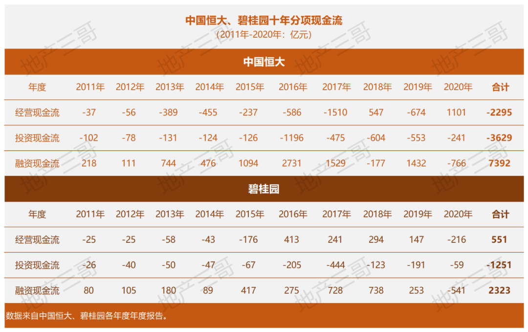 融資現金流:恒大明顯依靠融資驅動,十年來,恒大比碧桂園多借了5000億元。