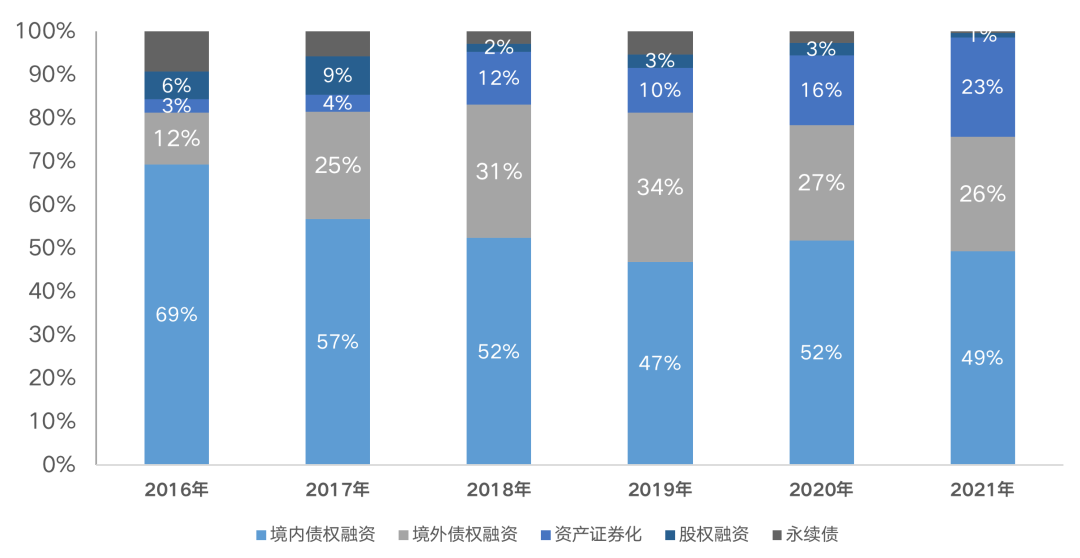 從融資結構來看,2021年融資占比最高的仍是境內(nèi)債權融資,占比達到49%。2021年房企境內(nèi)債權融資同比下降29%至6436億元;境外債權融資量3435億元,同比下降26%;股權融資和永續(xù)債分別募集112億元和58億元,降幅較大,分別較同比下降77%和88%,在三條紅線出臺后,永續(xù)債也納入全口徑負債監(jiān)管,企業(yè)永續(xù)債發(fā)債持續(xù)下降。