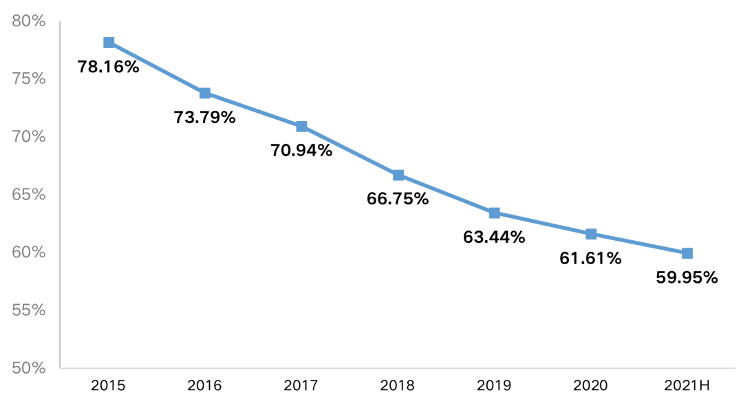 樣本房企歸母權益/總權益占比從2015年的78.16%減少至2021年中期的59.95%。少數(shù)股東權益增長過快,主要是近年來房企加大了項目的合作比例。