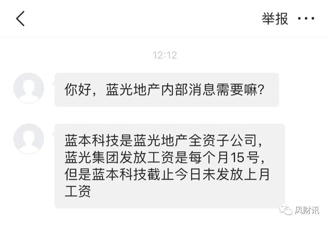 風(fēng)財訊報道 近日據(jù)藍光系員工爆料,藍光發(fā)展集團全資子公司“藍本科技”,截止5月18日仍未發(fā)放上個月(4月)的工資。藍光集團每個月15號發(fā)放工資。