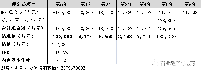 (1)期末處置收入=第6年NOI/期末資本化率=11593/6.5%=178350萬元;
