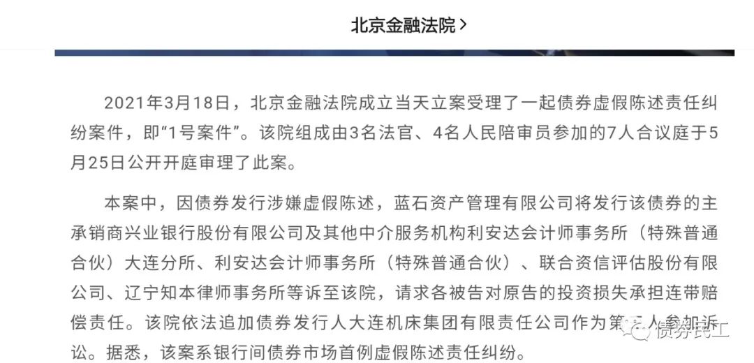 北京金融法院成立于2021年3月18日,成立當天即受理了大連機床債券虛假陳述責任糾紛案件,是北京金融法院的“1號案”。根據北京金融法院公開披露的信息,2021年5月25日法院正式開庭審理“1 號案”,大連機床債券虛假陳述責任糾紛案件系銀行間債券市場首例虛假陳述責任糾紛。