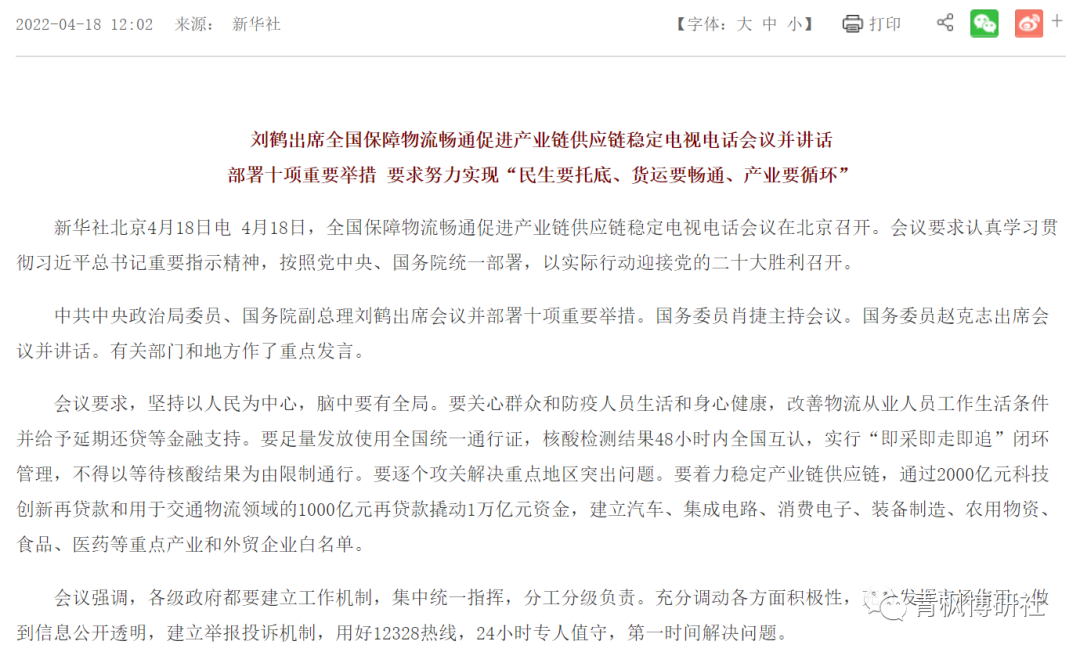 二、全國保障物流暢通促進產業鏈供應鏈穩定電視電話會議:釋放出更多信息
