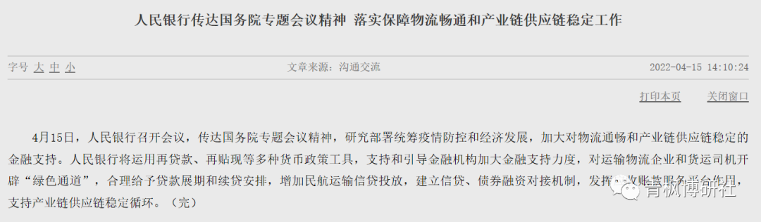 (一)2022年4月15日,央行召開會議,傳達國務院專題會議精神,進一步落實保障物流暢通和產業鏈供應鏈穩定工作,明確將運用再貸款、再貼現等多種貨幣政策工具,通過合理給予貸款展期和續貸安排,建立信貸和債券融資對接機制,支持和引導金融機構加大對運輸物流企業和貨運司機的金融支持力度,增加民航運輸信貸投放??梢钥闯?,此次會議的針對性較強,重在運輸物流行業。