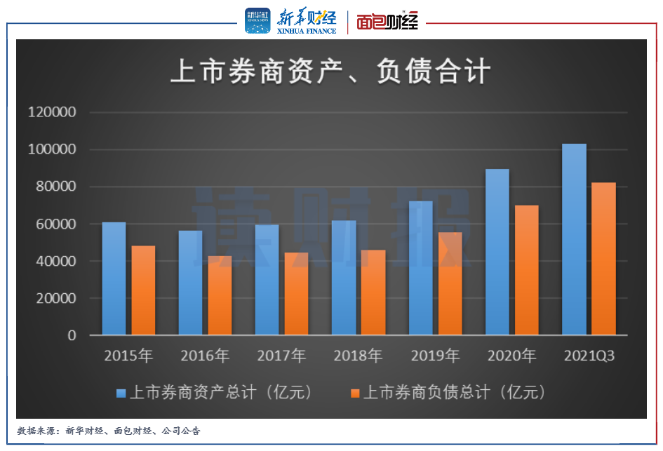 數(shù)據(jù)統(tǒng)計(jì)顯示,2016年至2021年三季度,合計(jì)40余家上市券商的總資產(chǎn)和總負(fù)債呈現(xiàn)出上升趨勢,整體而言,券商規(guī)模持續(xù)擴(kuò)張。