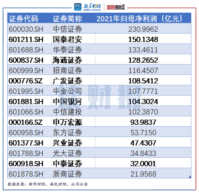 在已披露2021年年報(bào)的上市券商中,中信證券、國泰君安、華泰證券等9家大型券商的歸母凈利潤超過百億元。數(shù)據(jù)顯示,報(bào)告期間,中信證券在營收和歸母凈利潤兩方面,均為“行業(yè)第一”。