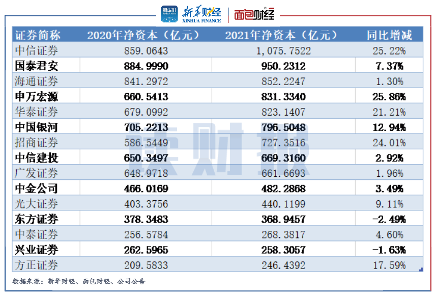 對已披露2021年年報(bào)的26家上市券商,合計(jì)期末凈資本超過1萬億,較上年增加超1成。其中,中信證券的期末凈資本超過千億元,國泰君安的凈資本超過900億元。值得一提的是,中信證券在2022年年初通過配股募得資金超220億元。