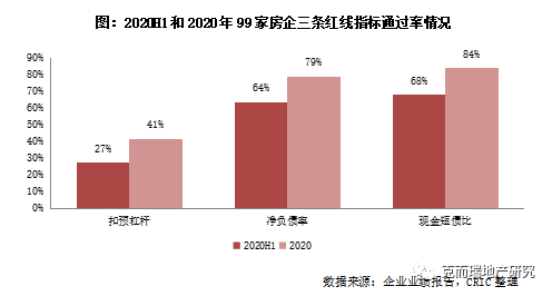從三個指標的通過率來看,均有明顯的提高。2020年底現(xiàn)金短債比的通過率最高,達到了84%,相比2020年上半年提高了16個百分點;此外凈負債率通過率也同樣較高,達到了79%,比年中提高了15個百分點。相較之下,剔除預收款后的資產(chǎn)負債率的通過率僅有41%,多數(shù)房企仍未達標,但相比年中仍有14個百分點的提升。