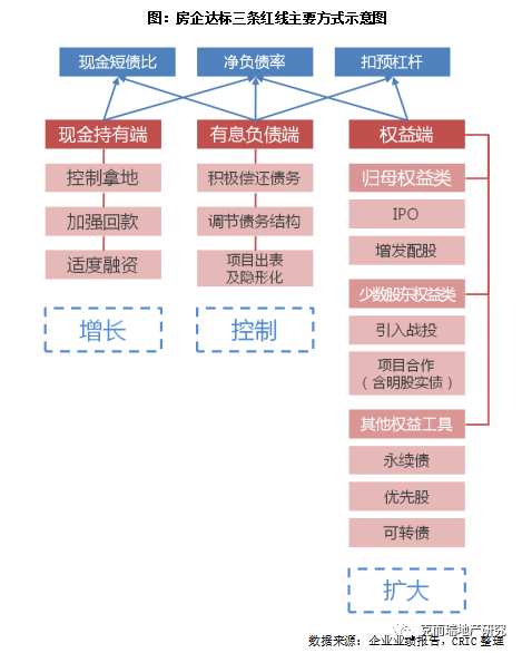 整體來看,房企要達標三條紅線,主要選擇了以下三個方面著手,分別是現(xiàn)金持有端、有息負債端及權(quán)益端。其中現(xiàn)金持有端,主要影響現(xiàn)金短債比及凈負債率指標:主要表現(xiàn)為提升經(jīng)營方面的現(xiàn)金回款,同時控制投資支出,保證適度的融資規(guī)模,以保障在手現(xiàn)金的充足。